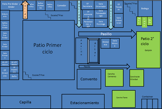 Al salir de la mampara, en dirección derecha, encontramos una pequeña bodega de material SEP, comedor de niños, baños niñas, baños profesores, baños niños, bodega material audiovisual u otros, al frente de esta, encontramos la enfermería, baños kínder y pre kínder, posteriormente las salas de kínder y pre kínder, Primero básico, oficinas de los directivos: Inspectora General, UTP Media y Básica y Directora, con sus respectivos baños.